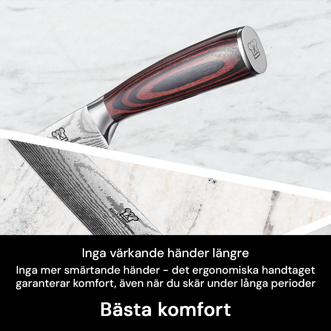Maximal kvalitet – till ett pris som överraskar Inga ömma händer längre – vårt ergonomiska handtag ger komfort även vid långa skärpass. Och det bästa? Du får en kniv för varje uppgift i köket.