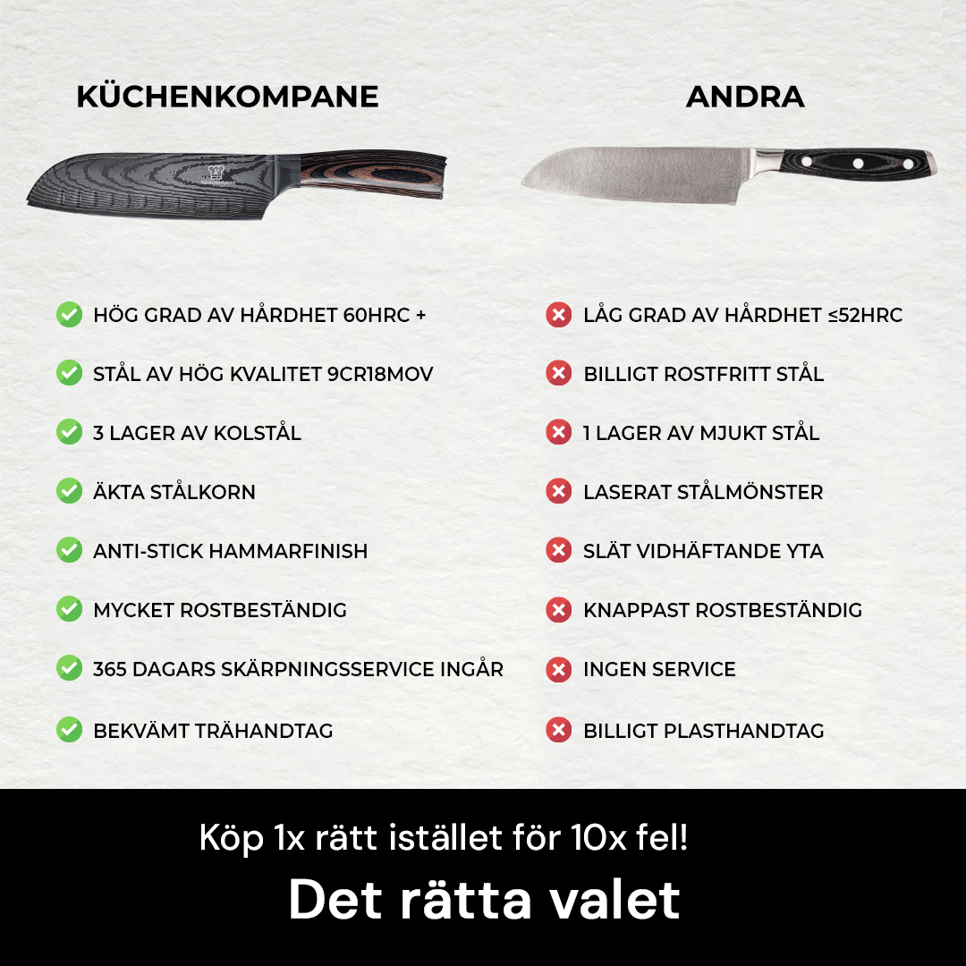 Vår jämförelse visar varför Kuechenkompane är det smarta valet. Med rakbladsvass precision, högkvalitativt stål och ergonomisk design får du bästa möjliga kvalitet och komfort.