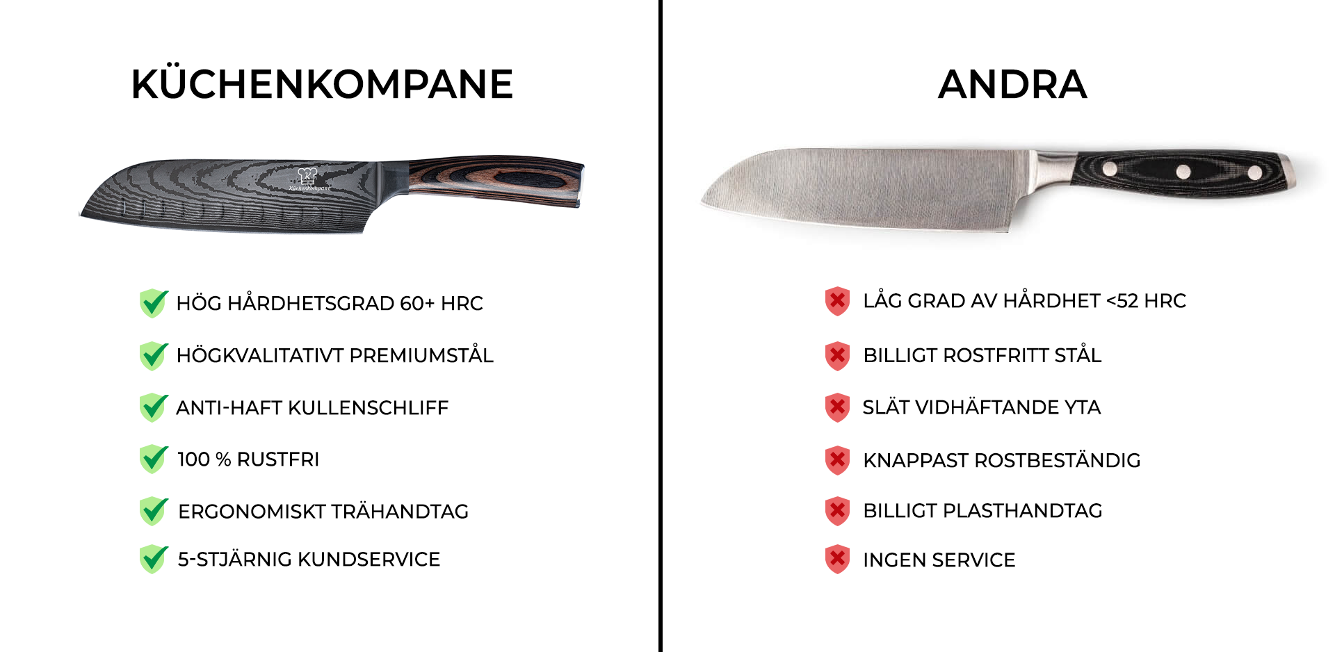Vår jämförelse visar varför Kuechenkompane är det smarta valet. Med rakbladsvass precision, högkvalitativt stål och ergonomisk design får du bästa möjliga kvalitet och komfort.